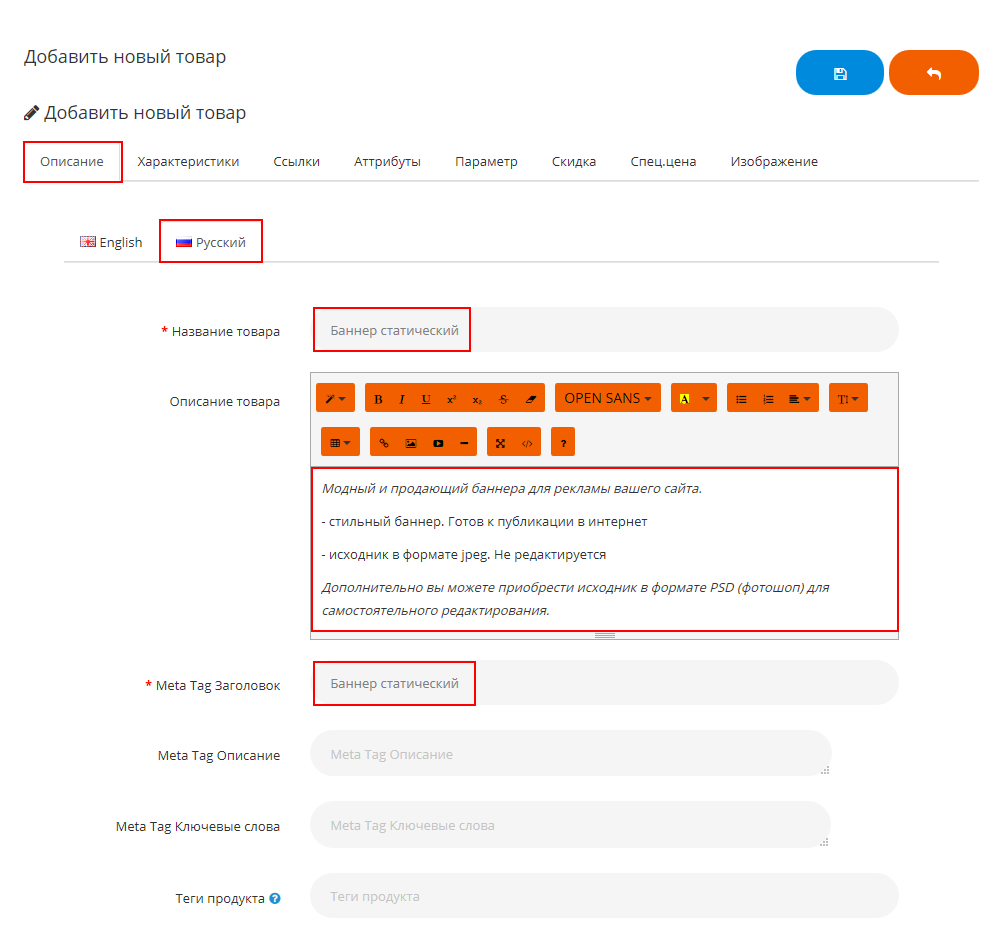 На вкладке «Описание» заполните название и текст (так же на двух языках, дублируя при необходимости).