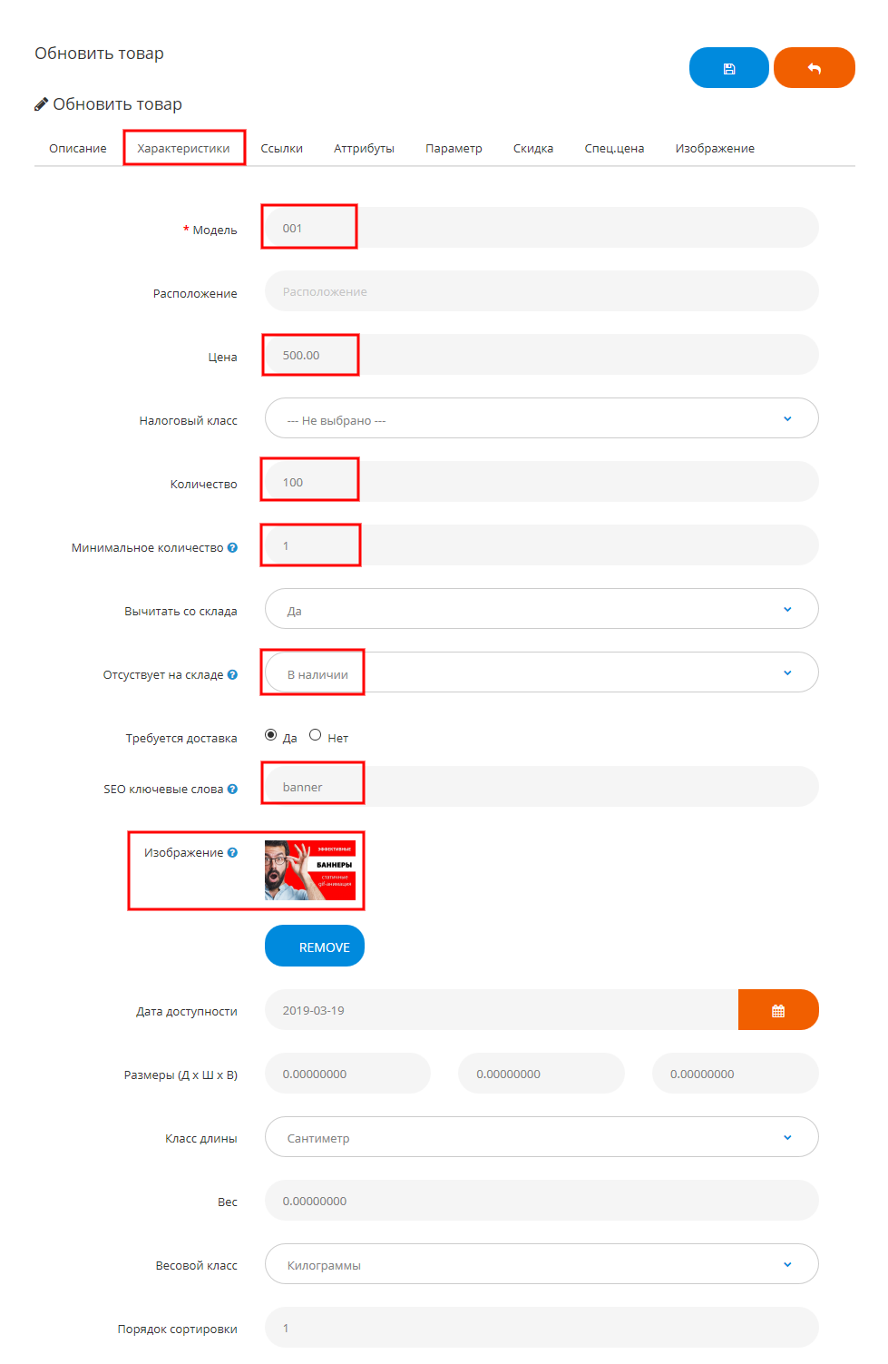 На вкладке «Данные» укажите цену и обязательно заполните «SEO ключевые слова» (латиницей, без пробелов).