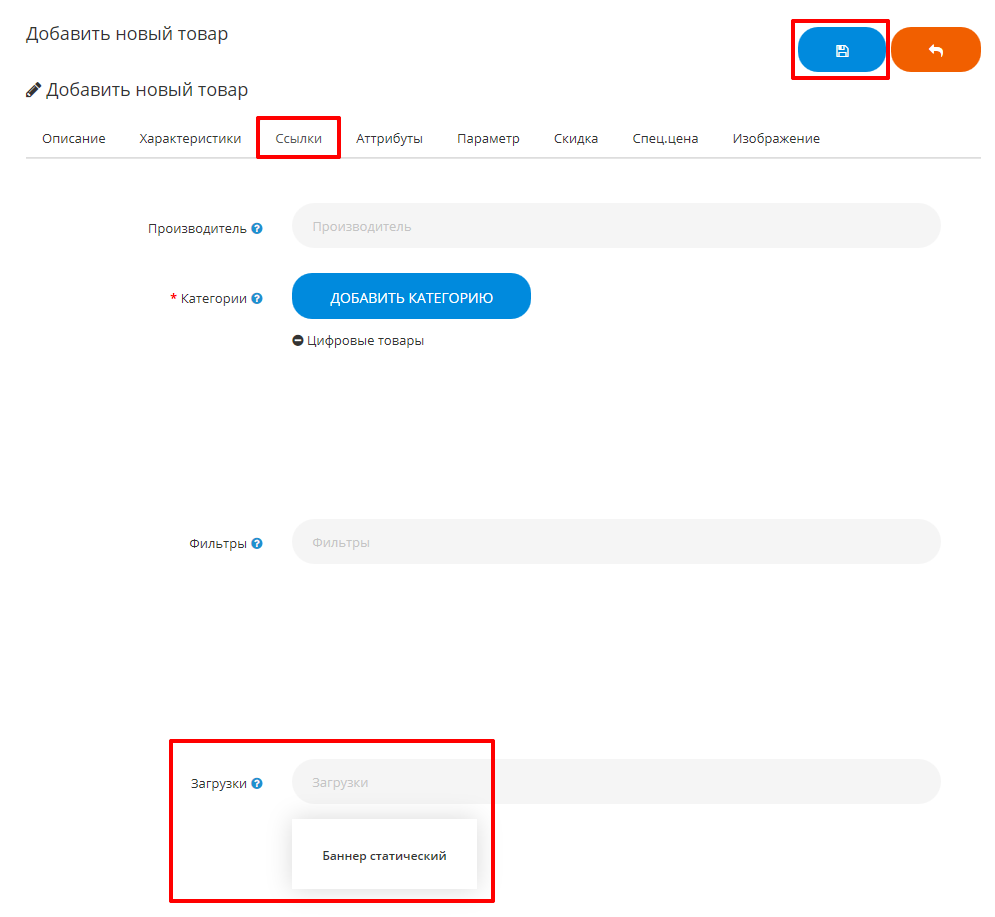 На вкладке «Ссылки» выберите категорию товара. А теперь самое главное: в поле «Загрузки» начните вводить название файла, который вы загрузили на первом этапе, и выберите его из выпадающего списка.