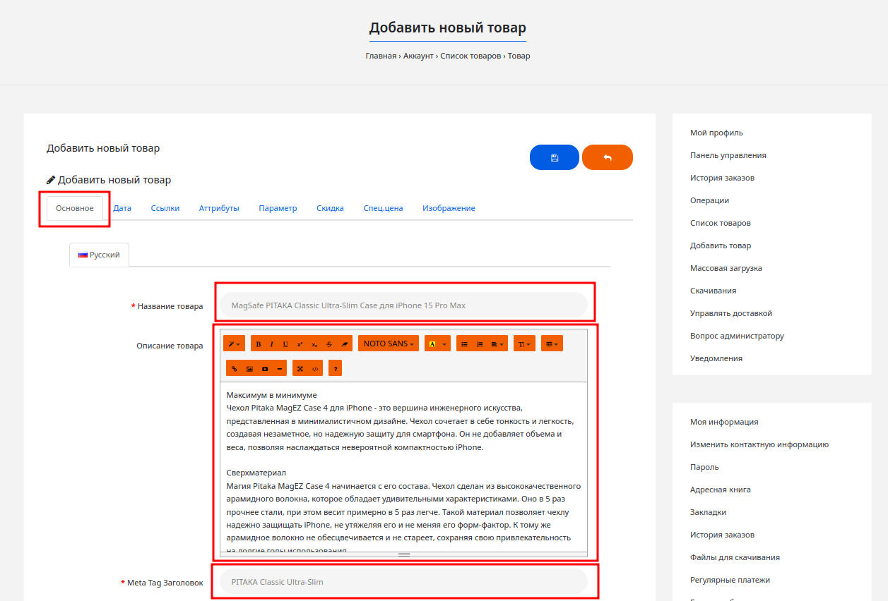 Здесь мы задаем «базу»: название и описание. Описывайте товар так, как рассказали бы о нем другу — честно и понятно. Заполните все поля, отмеченные красной звездочкой.