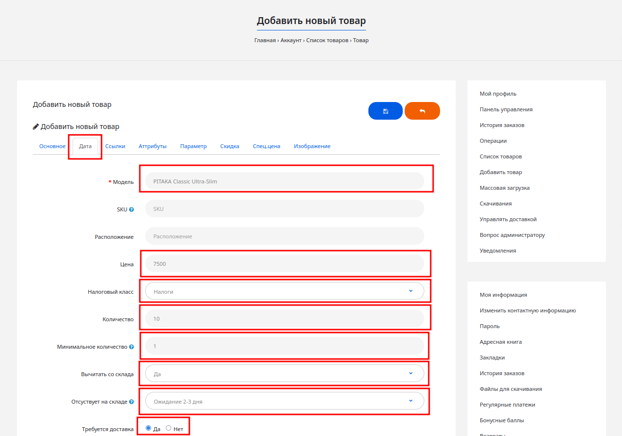 Настало время выставить ваш товар на витрину! Процесс состоит из заполнения нескольких вкладок. Не пугайтесь количества полей — обязательные отмечены звездочкой, остальные можно заполнить позже.
