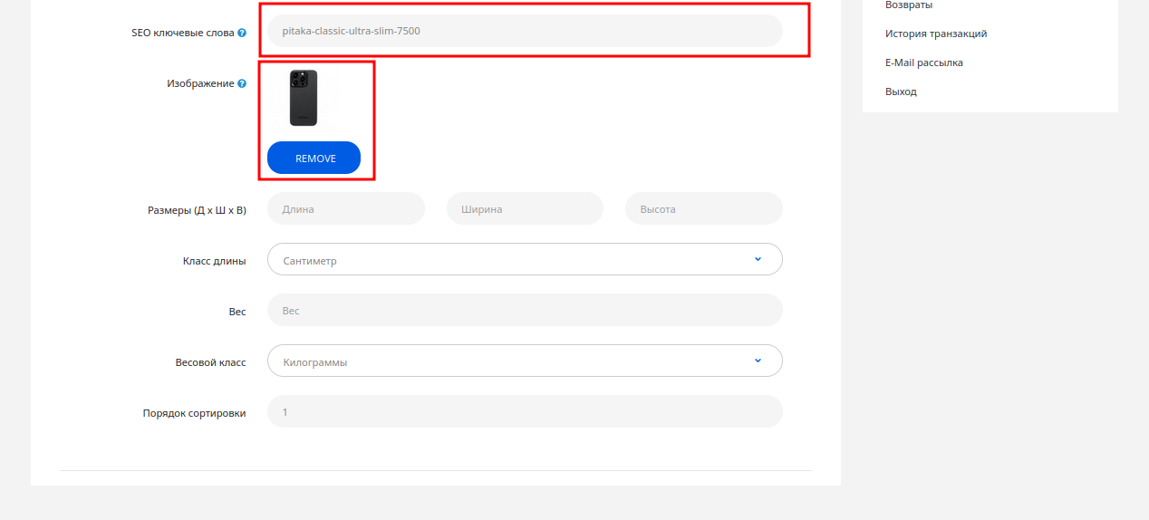 Переходим к техническим характеристикам. Особое внимание уделите полю «SEO-ключевые слова». Это то, как ваш товар будет выглядеть в адресной строке браузера и как его найдут поисковики.3. Вкладка «Данные» и магия SEO