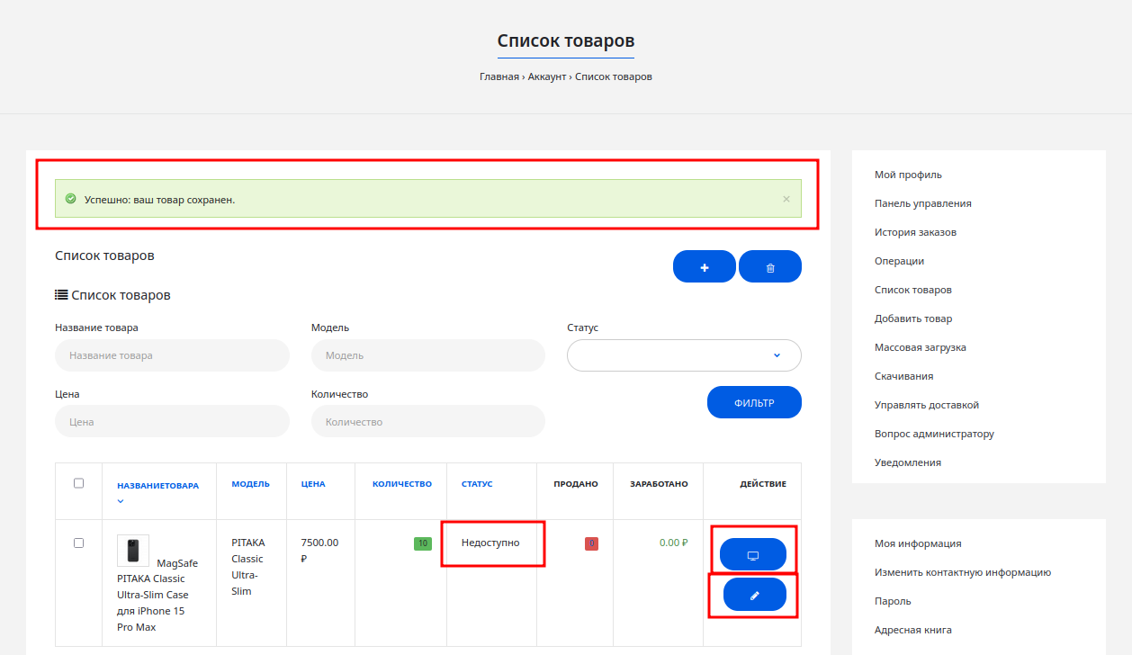 Пока товар на проверке, вы можете посмотреть, как будет выглядеть его страница, нажав на иконку просмотра (глаз).