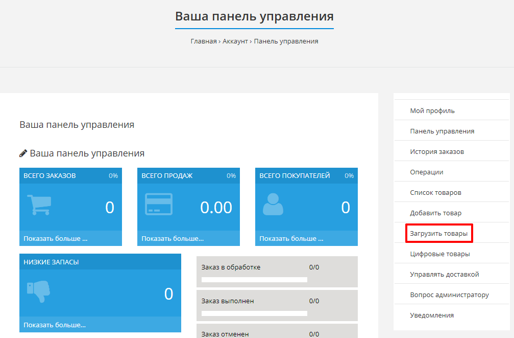 Если у вас десятки или сотни товаров, добавлять их по одному — долго. В FullBag предусмотрен импорт через файлы формата XLS (Excel). Это просто, если следовать инструкции. В меню вашего личного кабинета выберите пункт «Загрузить товары».Массовая загрузка товаров: экономим ваше время