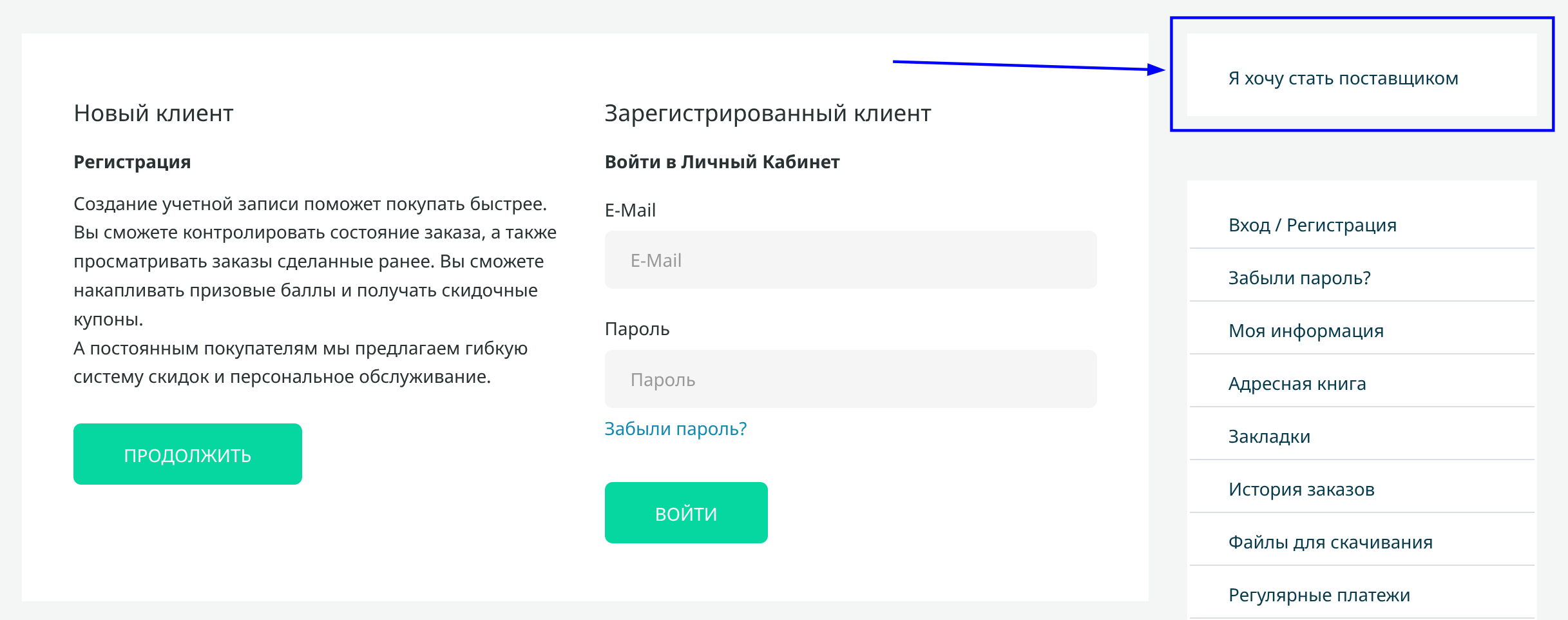 Откроется окно входа. Если вы у нас впервые и хотите сразу заявить о себе как о партнере, выберите в боковом меню пункт «Я хочу стать поставщиком».