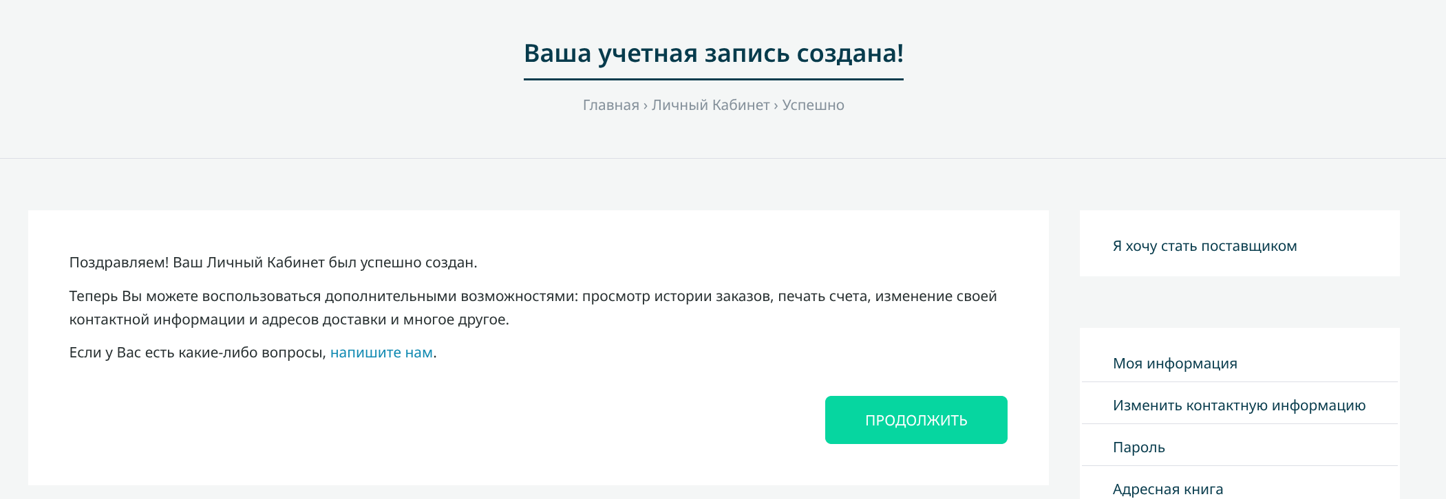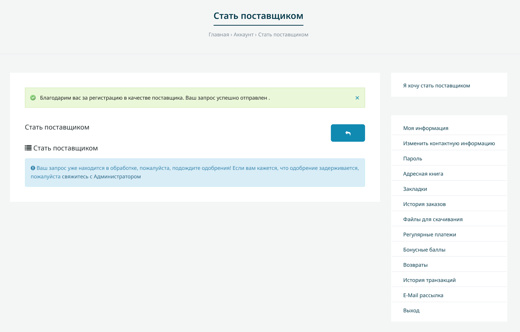 Регистрация аккаунта происходит мгновенно. Теперь нужно подать заявку именно на статус продавца. В личном кабинете снова нажмите на пункт «Я хочу стать поставщиком».